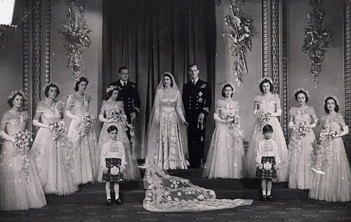 婚礼的伴郎伴娘(包括玛格丽特·罗斯公主):右边挨着菲利普王子以及花童。左起第三位是玛丽·剑桥夫人,左起第四位是亚历山大·肯特公主。