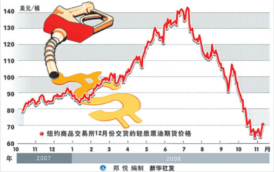 资料图片 国际油价一年来走势。国际油价从每桶140多美元,降至六七十美元,仅用了不到4个月的时间。