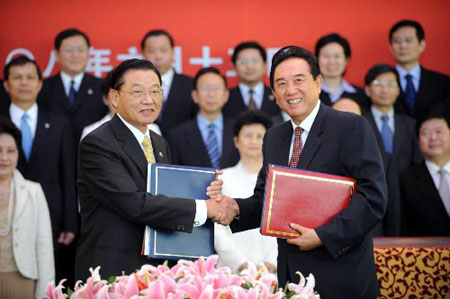 6月13日9时许,海协会与海基会在北京就两岸周末包机与大陆居民赴台旅游签署协议。这是海协会会长陈云林和海基会董事长江丙坤在签字仪式上握手。