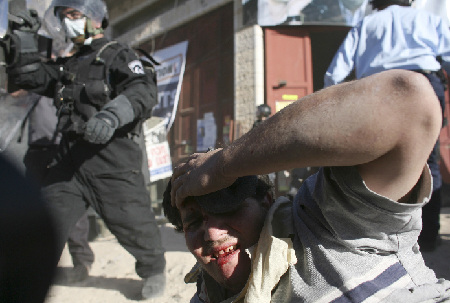 ![]() ![]() 一名受伤的犹太人定居者 ![]() 太阳落山时刻,大楼附近地区成了战场——军方和警察还在执行强制清除任务,平均4名警察负责把一个反抗居民拽出大楼,同时公路上到处是散落的碎石,火烧后的橄榄树冒起的浓烟笼罩了树林,头戴钢盔的士兵和愤怒的居民正面对峙。 附近的巴基斯坦人从屋顶和窗户中观望,还有人谴责以军为纳粹。也有一小部分人在上衣上绣上了黄色星型记号,就像当初希特勒迫害犹太人时所作的一样。 希伯伦共居住有约17万巴勒斯坦人,一些犹太人极端分子于2007年3月占据了这一地区的一栋四层楼房,并声称他们购买了此房,但当地的巴勒斯坦人予以否认。以色列法院2008年11月16日判决这一房屋买卖违法,不予承认,住在这栋房子的20余户右翼犹太定居者须在72小时内撤离,但是遭到拒绝。犹太极端分子一则要在希伯伦地区增加定居点数目,二则强调耶路撒冷对他们的宗教意义。 随后的两周内犹太人定居者反叛情绪高涨,开始向士兵扔石块并破坏巴勒斯坦人的房屋和建筑。军队的介入只是一个时间的问题。 (环球在线:霍默静) 更多相关新闻