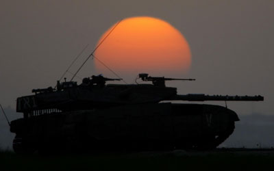 落日映照在以色列南部Kibbutz Mefalsim附近某军事集结区一辆坦克上。