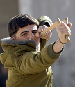 一名巴勒斯坦人用弹弓向以色列军队投掷石块。