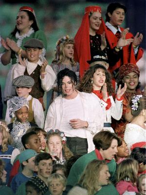 1993年1月31日杰克逊在美国职业橄榄球联赛超级碗中场休息时间的表演。