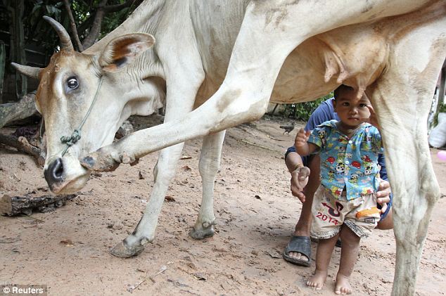 图:妈妈走了没奶喝 柬埔寨留守幼儿找奶牛哺乳