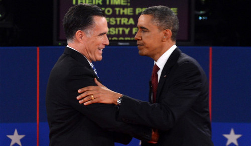 第二场总统候选人辩论后,罗姆尼和奥巴马握手致意