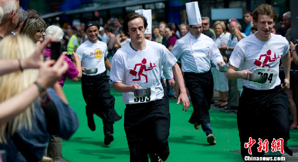 2011年6月5日,德国柏林举办了一场别开生面的侍者跑步比赛,厨师、服务员们纷纷加入其中,你追我赶不亦乐乎。