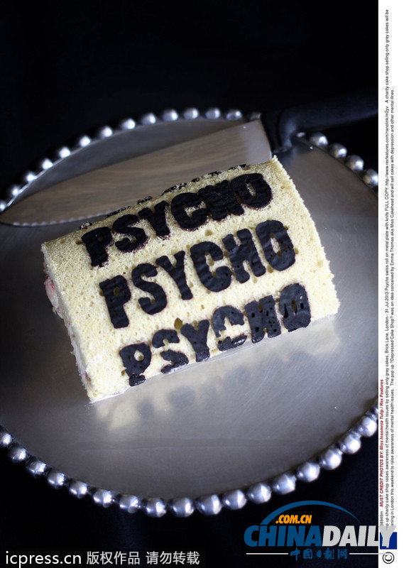 英国“抑郁蛋糕店”出售灰色点心,呼吁人们关注心理疾病。图为写有“精神病(psycho)”的瑞士卷。