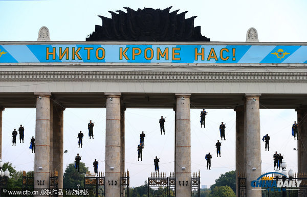 当地时间8月2日,俄罗斯莫斯科,俄罗斯伞兵(蓝色贝雷帽)在庆祝俄罗斯空军节日。俄国军人向人们展示了静止在空中的美感。