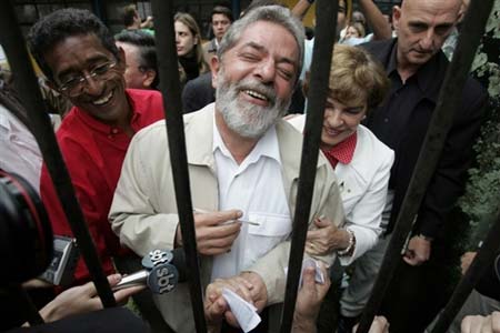 10月1日,巴西总统路易斯·伊纳西奥·卢拉·达席尔瓦在夫人的陪同下微笑着给民众签名。