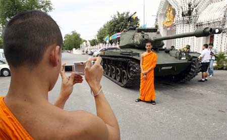 9月21日,泰国政变发生后,一名佛教僧侣在首都曼谷的坦克旁拍照。