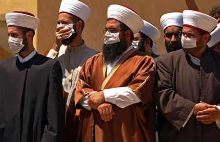 8月24日,黎巴嫩逊尼派宗教人士在黎以边境城镇参加一个大型的葬礼,他们不得不配带口罩抵挡死尸腐烂的味道。