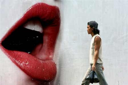 一名工人在去吃午餐的路途中经过印度尼西亚雅加达一幢公寓前的广告牌。