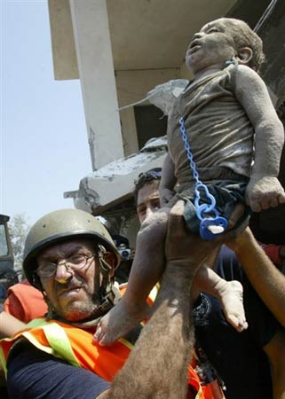 2006年7月30日,黎巴嫩南部,救助人员向着记者举起一名在废墟中挖出的婴儿尸体。