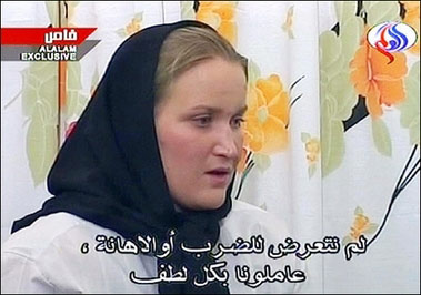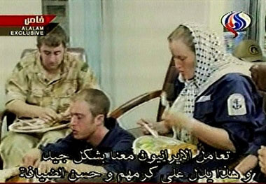 此前一天,伊朗电视台3月28日播放了英国女兵费伊·特尼与其他几名士兵一起用餐的镜头。在随后的接受伊朗电视台采访时,特尼头戴黑色头巾,一边吸烟一边说:“我是费伊·特尼,来自英格兰。我已经在海军服役9年,于3月23日星期五被俘,我们显然侵入了他们的水域。我受到了良好的待遇,他们都很和气,向我们解释了抓捕原因,没有伤害我们,他们非常慈善。”