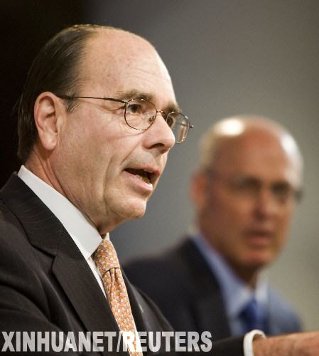 9月7日,美国财政部长保尔森(左)和联邦住房金融局局长詹姆斯·洛克哈特在新闻发布会上宣布,美国政府接管陷入困境的美国两大住房抵押贷款融资机构房利美和房地美。新华社发