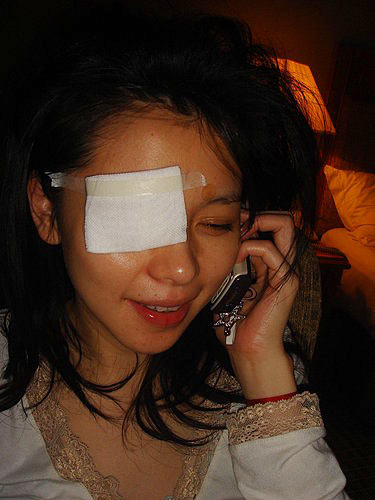 她昨(31日)在博客放上贴纱布的“独眼龙”照片,表示复原状况良好,右眼除微肿外已无大碍,“昨天只可以张开半只眼睛,今天整只眼睛都可以睁开了”。她回忆当时情形,“没想到一起床眼睛睁不开狂流眼泪,痛到不能说话。痛到以为自己要瞎了,完全不知道发生什么事,就去医院急诊。医生说是眼角膜受损,任何原因都有可能。”