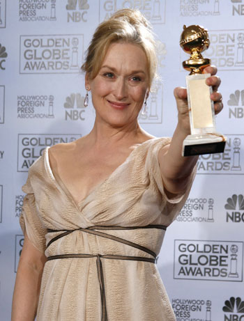 Actress Meryl Streep holds her award for best actress in a comedy or musical motion picture for her role in 'The Devil Wears Prada' at the 64th annual Golden Globe Awards in Beverly Hills, California January 15, 2007. [Reuters]