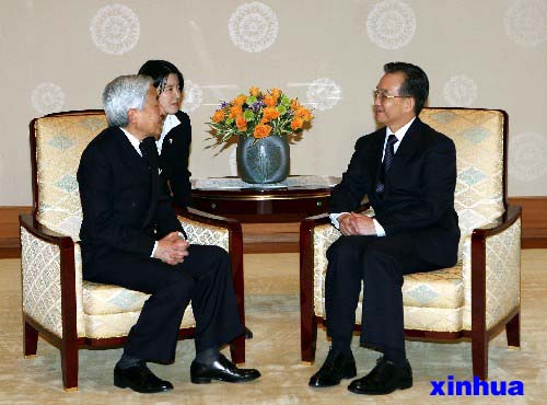 正在日本进行正式访问的中国国务院总理温家宝在东京会见日本明仁天皇