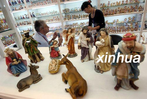 10月27日,一位比利时客商在广交会流花展馆的工艺品展区挑选树脂圣经人物塑像。在广州举行的第100届中国出口商品交易会(广交会)上,中国的工艺品参展商为使自己的产品更具国际竞争力,越来越多地将国外的文化理念融入产品设计当中,制作出具有异国情调的工艺品,深受外国客商青睐。新华社记者 刘大伟 摄