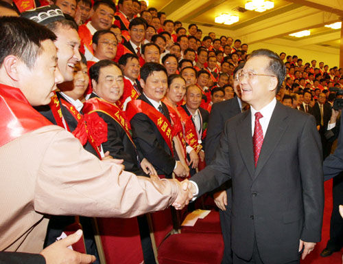 图片说明:9月27日,中共中央政治局常委、国务院总理温家宝在北京人民大会堂会见全国煤炭工业劳动模范、先进集体代表。新华社记者李学仁 摄