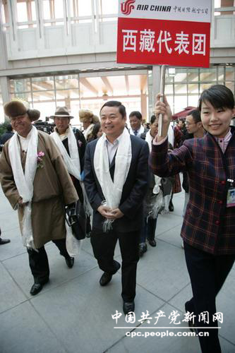 出席党的十七大的西藏代表团12日10时25分乘飞机抵达首都国际机场,成为第一个抵达北京的京外代表团。