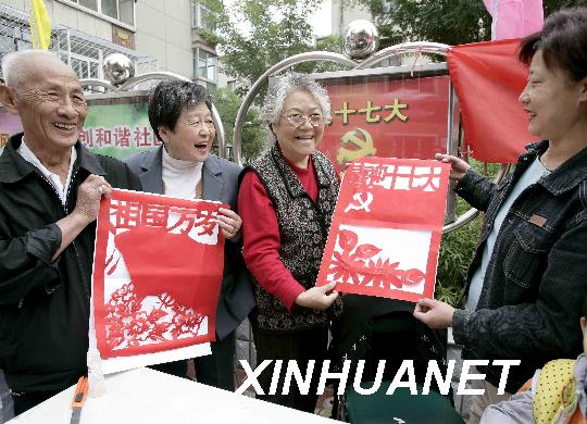 10月9日,北京朝阳区六里屯街道退休教师孙慧敏(左二)等居民在展示剪纸作品“喜迎十七大”和“祖国万岁”。当日,北京朝阳区六里屯街道的群众走出家门,制作墙报,表演节目,喜迎十七大。新华社记者陈建力摄