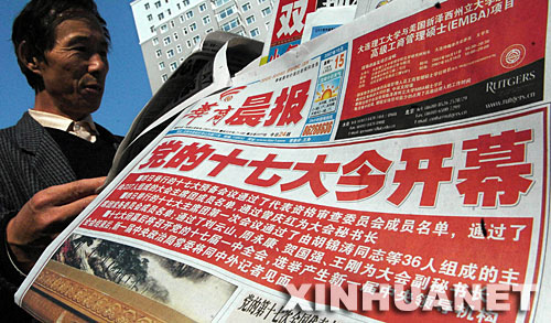 10月15日,一位沈阳市民在街头购买报纸,关注十七大。新华社记者 谢环驰摄