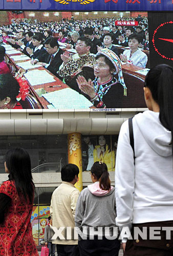 10月15日,市民在南京新街口街头一大屏幕前观看十七大开幕会电视直播。新华社记者 孙参摄