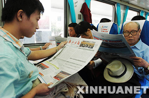 10月15日,T6次越南―北京国际联运列车上的旅客在阅读有关十七大的报道。