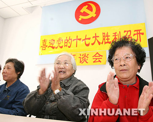 10月15日,北京宣武门广外街道车站西街15号院社区党员在收看十七大开幕会后举行座谈会。 新华社记者 陈建力摄