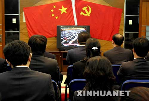 10月15日,农行北京石景山支行的干部通过电视观看十七大开幕电视直播。 新华社发(梁鑫摄)