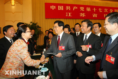 10月16日,胡锦涛同江苏代表团代表一起审议党的十七大报告。这是胡锦涛同来自基层的代表亲切交谈。