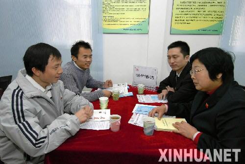 这是2006年1月8日,北京市东城区和平里街道共产党员志愿者吕福庆(右一)与社区外来务工人员中的党员交谈。当日,北京市第一家以服务社区、服务社会、服务党员、服务群众为宗旨的街道社区党建服务中心成立。该中心将帮助在新经济、新社会组织中从业的党员以及失业下岗、身患疾病、生活困难的党员,通过党员志愿者服务活动,为他们提供法律援助、心理咨询以及物质帮助。新华社发
