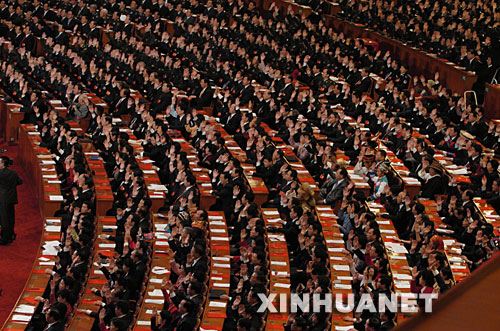 10月21日,中国共产党第十七次全国代表大会在北京人民大会堂胜利闭幕。这是代表在举手表决。