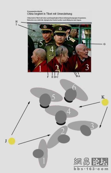 一、图中人物2,3有来自于画面右后方的侧逆光光源照射(视图标k),故人物2的下嘴唇有高光点并在额头有轮廓光(视图标B),人物3头顶及后脑勺部有轮廓光。但分析图片人物4,5,6其光源来自于画左前方,如按光源k的光照方向,人物4的左侧脸部与人物2的脸侧部为同一受光面,故其左侧脸部及左肩应为亮部。但图片中人物4的脸部及肩部均为背光面。人物4,5,6脸部光源来自于画左前方(视图标J),其右胸部的受光面为光源直射区可以证明。