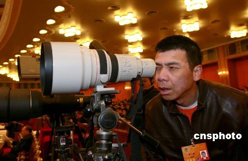 全国政协十一届一次会议第二次全体会议在北京人民大会堂举行。著名导演、北京电视艺术中心的冯小刚委员在大会堂借用摄影记者的长焦镜头细观会场。中新社发盛佳鹏 摄