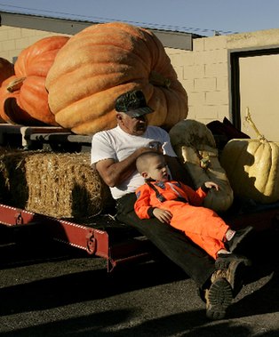 一名参赛者和他四岁的小孙子在一车巨型南瓜前休息
