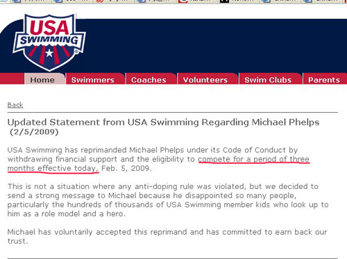 美国游泳协会对菲尔普斯禁赛处罚的公开声明