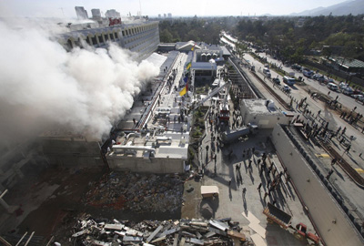 当地媒体援引目击者的话说,大火已经烧光了酒店的底层,包括大堂。二层也严重损毁,火光熊熊,浓烟从窗口滚出。消防部门和警方已赶往现场,目前已经基本控制住火势。