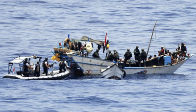 进入今年以来,索马里海盗共袭击了80多艘船只,是2003年时这一数字的近4倍。目前,他们控制了至少18艘船只和310多名人质。今年以来,欧盟、美国、中国、印度等纷纷派出军舰前往索马里以北的亚丁湾海域巡逻护航。