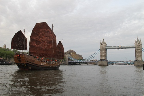 6月27日正值伦敦奥运会倒计时30天,受邀来英国的中国民间古帆船“欢天蓝舵”号启动奥运文化巡航活动,在伦敦塔桥奥运五环之光的照耀下圆满完成首个奥运庆祝活动。