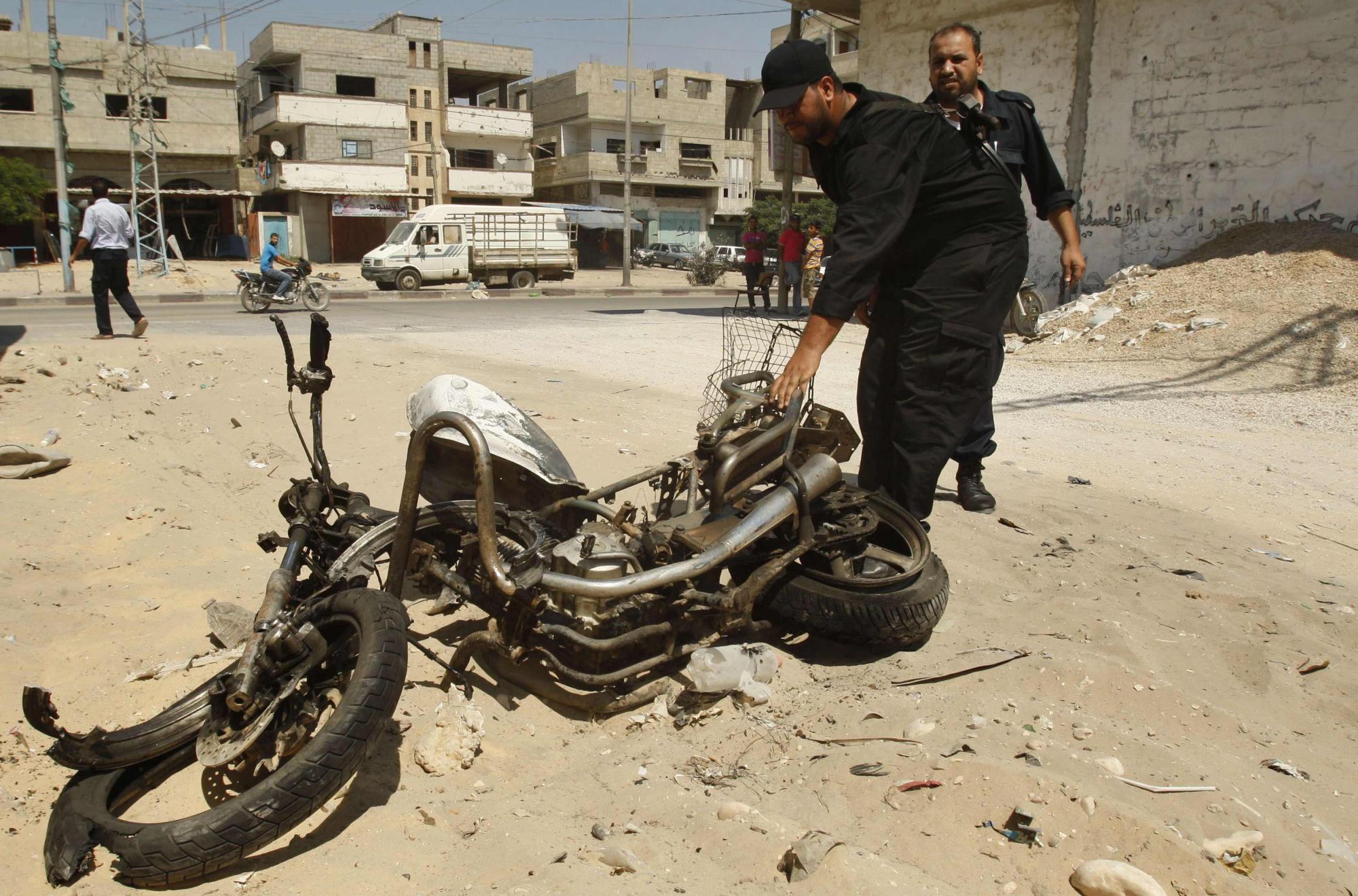 巴勒斯坦警方正在检查一辆在以军空袭中炸毁的摩托车残骸。