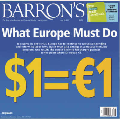 改善财政赤字可以促进经济增长,而促进经济增长最快的方式就是利用通货膨胀。更便宜的欧元(与美元平价)可以增强欧洲的竞争力、结束债务危机,同时还能挽救欧元本身。过去10年,欧洲一直是这么做的,欧元与美元的比价从最高的1∶1.6降到了2008年的1∶1.22,可是此后欧元停下了贬值的脚步。
