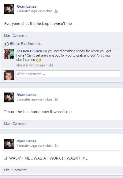 瑞安在Facebook上为自己辩解“所有人都闭嘴,那不是我”,“我在回家的车上,那不是我”,“那不是我!我在工作!那不是我!”