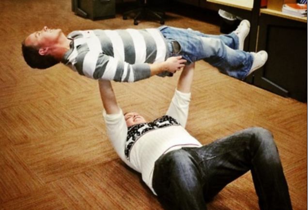 理查德让朋友把自己当杠铃举起来。