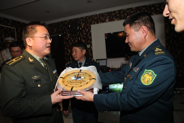 蒙古国科布多省边界代表恩和太平向记者赠送新春礼物