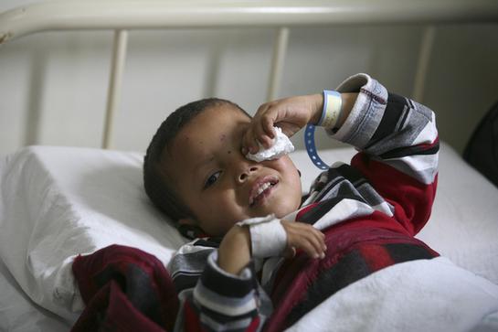 这名男孩是战争难民。他受了伤,正在医院接受治疗。
