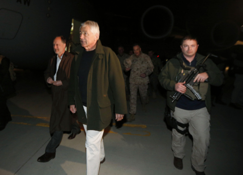 美国国防部长哈格尔(中)访问阿富汗