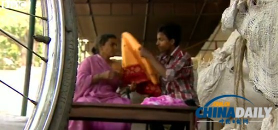在印度坎普尔一间积慢灰尘的房子里,年轻人坎海亚从购物袋中取出一条亮黄色纱丽,呈送给母亲。