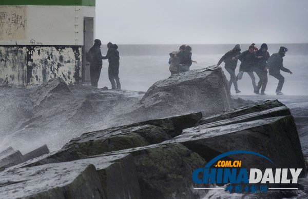 10月28日,荷兰艾默伊登,荷兰遭遇强风暴袭击,人们在码头上艰难行走。(图片来源:CFP)
